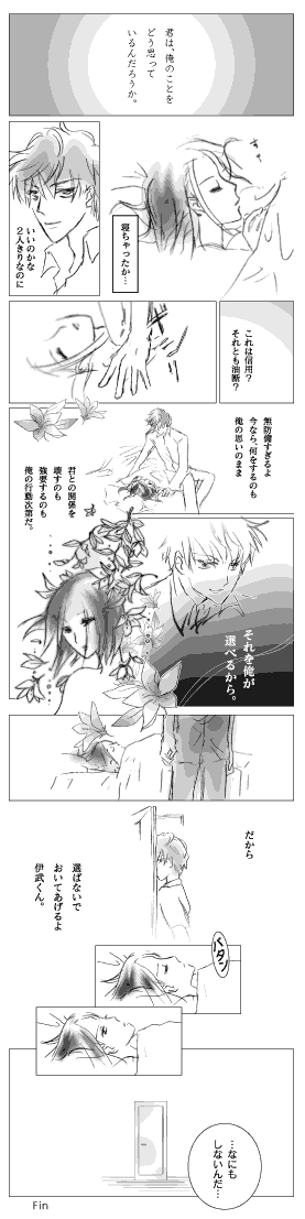 成績は関係なく、頭の良いタイプで聡い人間。 でも合格点なんですよ、満点ではなくて。 その点、跡部さんは満点。 周囲が跡部の適材適所的な部分を押さえているから、さらに問題なさそう。 みたまま的な役割。 跡部たまも帝王学を学んできているはずなので、 「俺様のするべき事」が染み込んでいそうです。 その点、千石さんはやる事なす事、広くて浅そうで漠然としてます。 器用で不器用な男、清純!! 一見大丈夫そうに見えるけど実はそうじゃないぜ的な。 なので、お兄さん気質なお相手をみつけないといけませんね。 伊武さんなんてどうでしょう。 ビシビシ厳しく鍛えてくれますよ。 といっても千石さんは狼の皮をかぶった狼なんですけどね!! |