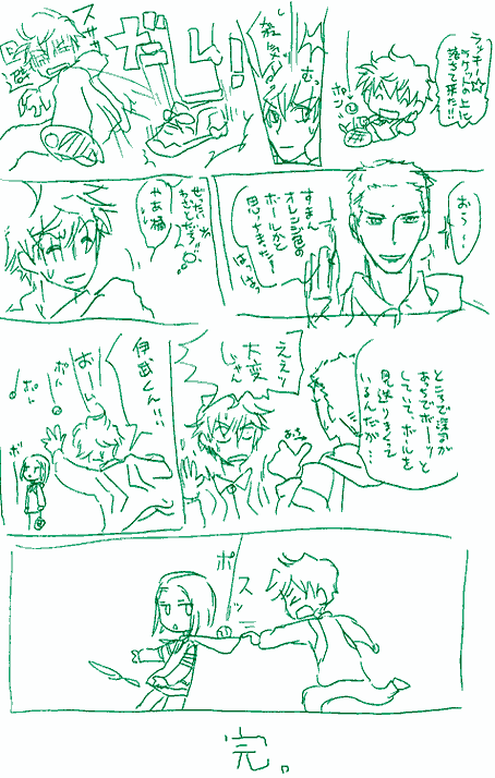 いらっしゃいませ〜!こちらこそ回してくださってありがとうございます! バトン答えるの楽しいですー。字書さんばとんは、自分で意識してない事が多くあっていろいろ発見できました(笑) あと、一字バトンはものすごく一方通行前提で答えたものですので、お気になさらず!目撃していただけただけで嬉しいです。 冬で挙げてしまいましたが、ルコさんの前サイトの時からページデザインがシンプルかつキュートクール(キュートクールって伊武くんっぽい!!) でステキと思っていたせいかもしれません。 一文字の選択肢ですと、サイトデザインのイメージってどうしても大きいですね(笑) これからもちょこちょこお邪魔させていただきますー!ありがとうございましたv ---- 明日はホワイトデーですね! 千石さんは大きなリボンを購入したようです。 伊武さんドン引き! 跡部さんは甘いモノ好きな神尾のためにマシュマロプールを庭に作りました。 伊武さんドン引き! 千石さんドン引き! 神尾は大喜びです。 |