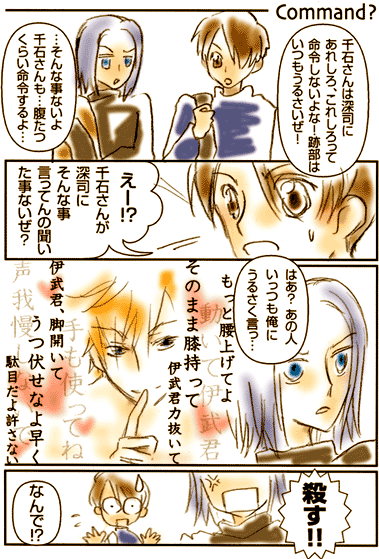 皆が「お〜っ」ってどよめいてた 筋肉隆々事件があったじゃないですか。 (微妙に正しく) 男の子はやっぱり筋肉憧れますよね!! 「聞いてくれよぅ、深司!跡部に腕相撲で勝てねぇ〜」 「ふーん…」 「でよぅ、跡部はよぅ、腕をグッとしたら力こぶできるんだぜ!」 「ふーん…」 「俺も力こぶできるけど、跡部より小っせぇ…」 「ふーん…」 「俺たちも鍛えようぜ!」 「いいよ。俺も鍛えようと思ってた。」 「深司もか!」 「うん。千石さんがさ、噛むんだよ」 「…へ?」 「あんまり噛むから腹が立って俺も噛み返したんだよ」 「そ、それってどういうシチュエーションだよぅ!」 「うるさい。そしたらさ、千石さん力を入れたんだよ」 「はあ」 「神尾の言う、力こぶだよ、あれ、硬くて噛めなかった」 「……」 「神尾、悔しいと思わない?」 「お、おう」 「俺も筋肉モリモリになって、噛めないようにしてやる」 「うーん…」 「じゃあ神尾、ダンベル体操始めるよ…」 PR