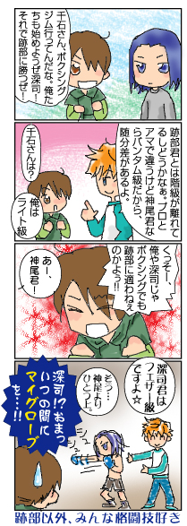 テニを知らなかった頃は、地元のイベント会場のレイヤーさんたちを見て 本当に部活帰りのお嬢さんが来ているのかと思って見てました青学ジャージ。 そして何より、36というカップル表記がジャンプ見てるだけじゃわからなくて、 しかも私、野球の同人で背番号で表現される本を何冊か持ってたせいもあって、 中学生のテニスって、背番号でもあるのか…? と悩むことひとしお。 伊武深司には全く興味がなく、神尾の妖怪顔に萌え、橘さんと赤澤に萌え。 そんな感じでズブズブと、気付けばこんな所で4人を愛でています。 ★テニヌ原作予想★ 全国大会の最終試合で決着がつく寸前!! 会場が異次元に飛ばされた! こんな事をしている場合ではない、実は今、世界は滅亡の危機に瀕しているのだ! 地球を、愛する友を救うために、中学生の男の子たちがラケットを持って命を賭け戦う! 全国大会は人間を超えた技を身につけるための特訓場でしかなかったのだ。 日曜赤で六角中 月曜黄の立海大 火曜浅葱は四天宝寺 水曜空色氷帝学園 木曜茶にはルドルフで 金曜緑の山吹中 土曜青は青学だ! 虹色テニヌボール! サービスエース! レインボーーーーースプラッシュ!! あっ、不動峰は黒いからない! 銀曜日は銀華だゼ☆ あああ、紫の比嘉も入らなかった…! 行け! 皆で無我れ! 七色のボールで人類の滅亡を防ぐのだ! 少年たちの戦いは、これから始まる! |