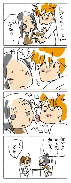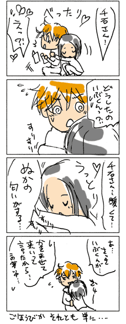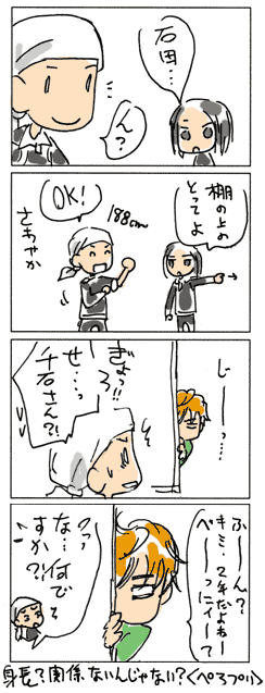 × [PR]上記の広告は3ヶ月以上新規記事投稿のないブログに表示されています。新しい記事を書く事で広告が消えます。 にんじゃのぶろぐ… にこにことようつべのコマンドが増えてから 今迄のブラウザでボタンが押せぬ… いちいちツール変えるのが面倒でならん。 ところでしばらく前から鼻水が止まらないのは アレルギーですか?風邪ですか? 目も痒い…気管も変…いっそ風邪の方がいいのですが。 アレルゲンの特定ができません。 今はなんだ。花粉じゃないのか? ヒョウダニか?ハウスダストか? 掃除してるのになあ。これ以上どうすれば。 アニメのにゃんこいを見ると、 あの母親と妹に殺意を憶えます。 酷いよ、笑って苦しめと言ってるようなもんだ…。 ツンデレヒロインに苛められるのなら、 どんなひどい鬼畜行為も有りだと思うのに、 これはマジでヒドイよ!主人公、よく耐えてるよな… ほんとひどいよ… でもニャムサスかっこいいっす!! PR 帰りに酒屋さんに寄ったら、クリスマス用らしいシャンパンが いろいろおいてありました。 でも目的のお酒は無かったんだ。がっかり。 最近、いろんなお店で店員さんがサンタ帽をかぶっていますね。 酒屋のレジもみんなサンタでした。 山吹中では千石さんが率先してサンタ帽準備して 今週の部活は全員サンタで!とかやらないかなあ。 案外不動峰でも橘さんが突然言い出して全員サンタやらないかなあ。 氷帝も思いついたらやっちゃいそうだ。 六角はオジイ含めやっぱりやりそうだ。 ルドはミッション系だし土壌が有りそうだ 青学も大石さんが突然ヤル気出したらやっちゃいそうだ。 四天は何か勘違いしながらやっちゃいそうだ。 なんだ、みんなノリがいいな! 絶対にやらなさそうなキャラが居ない勢いですね。 うーん… 真田さんも部長に笑顔で帽子渡されたらかぶらざるを… あれ?そんな姿をアニメで見た様な… ちなみにサンタ帽、 真田とリョマたんは普通にかぶりますが、 内村くんは帽子の上からかぶります。 石田鉄はどうしたらいいのかわかりません。どうしよう。 拍手レスです☆11/24の0時頃の方へ♪ いらっしゃいませ! 11月祭祝いとして地味に続けておりました連日の四コマ… 初めてお褒めの言葉もらいました!ありがとうございます〜! 落書き状態ですが、粘っこい愛をたっぷり込めております。 幸せ気分になっていただけたなら、とっても嬉しいです! ををををを〜パラレルも頑張るです!! 何をさせてもどんな状況においても愛でたいカップルなので パラレルは書いていて楽しいです♪ 拍手ありがとうございましたー!! -------- 物語の構成上は重要でも、代替可能なアイテム 例えば、機密書類、マイクロチップ、ダイヤ、爆薬、金塊、のような キャラクターの動く目的になるなら何でも良い、みたいな物の事を 映画言葉でマクガフィンというそうです。 センイもベカミも最高カップルなので、 パラレルにおいてはバックボーン事体が大きなマクガフィンですね! |