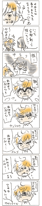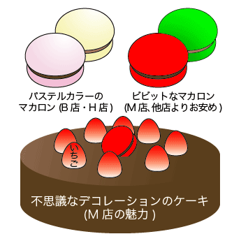 ☆11/9の12時頃のかたへ☆ いらっしゃいませー! 眠れない四人に可愛いとのお言葉、ありがとうございます!! キュンキュンしていただけましたかv嬉しいです! きっと夜に羊を数えるほどの事態になれば、 四人とも妄想膨らんで最終的に違ったこと考えていそう…と思ったのですが 最初から発想が羊にならない辺り本当にばかちん揃いですv また遊びにいらしてくださいね♪拍手ありがとうございました〜! --------------------- ケーキが好きです! 深司たんの誕生日にはしっかりケーキを食べました。 近くのショッピングセンターには ケーキ屋さん、B店・H店・M店、があります。 B店ばかり利用するので、ポイントカードがもりもり溜まっております。 個人的に、ケーキの美味しさは B店>>M店>>>H店、なのですが デザインが H店>>B店>>(超えられない壁)>>M店 M店の什器内が大変エキサイティングです。 例えば コーティングチョコがツヤツヤしておらず全面マットだったり、 粉砂糖のかかり具合が不思議な程不均一だったり、 ケーキ屋なのにケーキの切り口がボソボソだったり… は、まだまだ、何でもない普通の事。 凄いのはケーキのデコレーションセンスです。 ホールケーキの上、 赤いイチゴを円を描く様に置き、中央に赤いマカロン1個がグサッと突き刺さっている (他の飾り一切無し) 白いショートケーキの上、何故かチョコケーキの切れ端がグサッと突き刺さっている (あまりの無造作さ、大胆さ) この奔放な飾り付けが気になってついつい訪れ、ケーキを眺めております。 他には、3店とも置いてるマカロン、B店・H店は可愛いパステルカラーなのに M店は激しくビビットな真紅や眩しい真緑という。 思わず図解。 毎回どんな意外性のあるケーキを目撃できるのか、ワクワクします。 そういえばバレンタインデーの季節にはチョコで出来た車が… 真っ直ぐな板状チョコを張り合わせた、つなぎ目などに頓着しない、 違う意味で目を見張る出来映えの車が、 外からもわかる目立つ場所に展示してありました。 しかしM店、超スタイリッシュなオシャレケーキを置いてるH店よりはずっと美味しいです。 バサバサで水っぽいクリームが存在する事を教えてくれたのはH店です。 あの不味さは抜きん出ている。 |